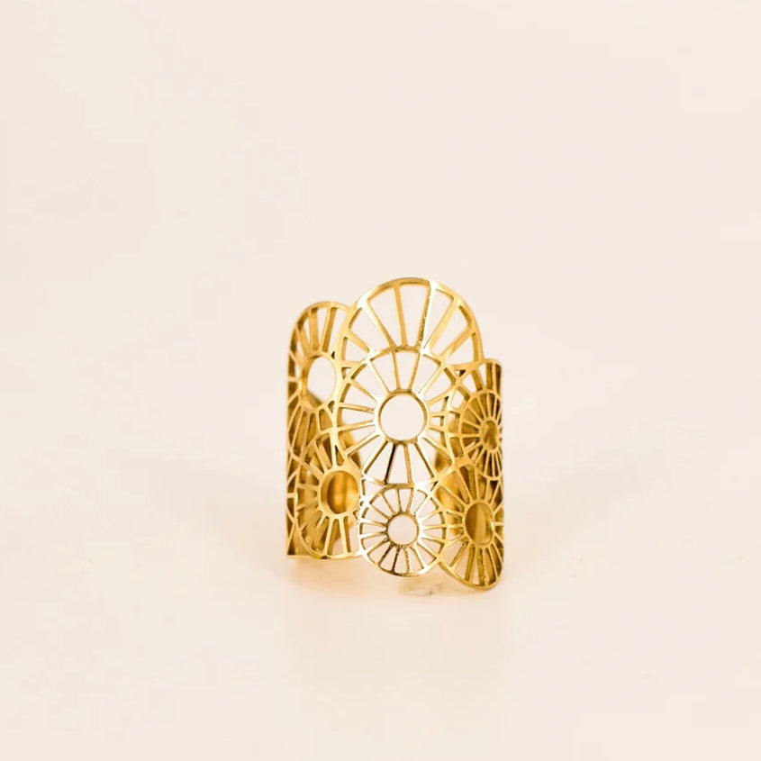 - Anello a fascia grande con cerchi traforati a forma di fiore asimmetrico