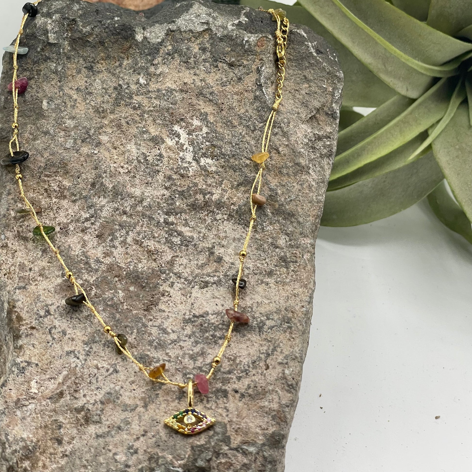 - Collana in corda dorata con pietre colorate e occhio colorato al centro