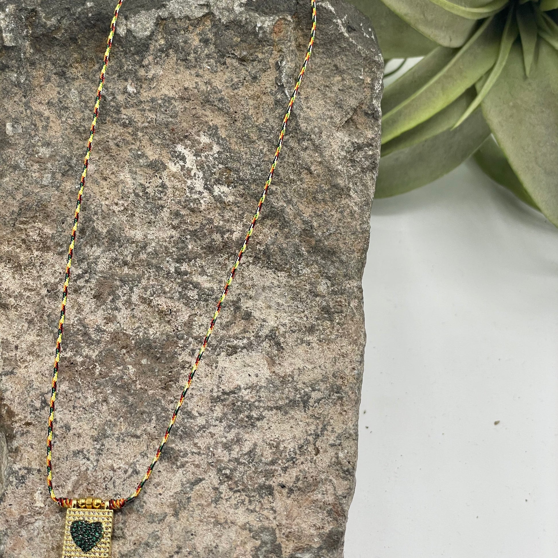 - Collana in cordoncino colorato con ciondolo brillantinato argento e cuore verde