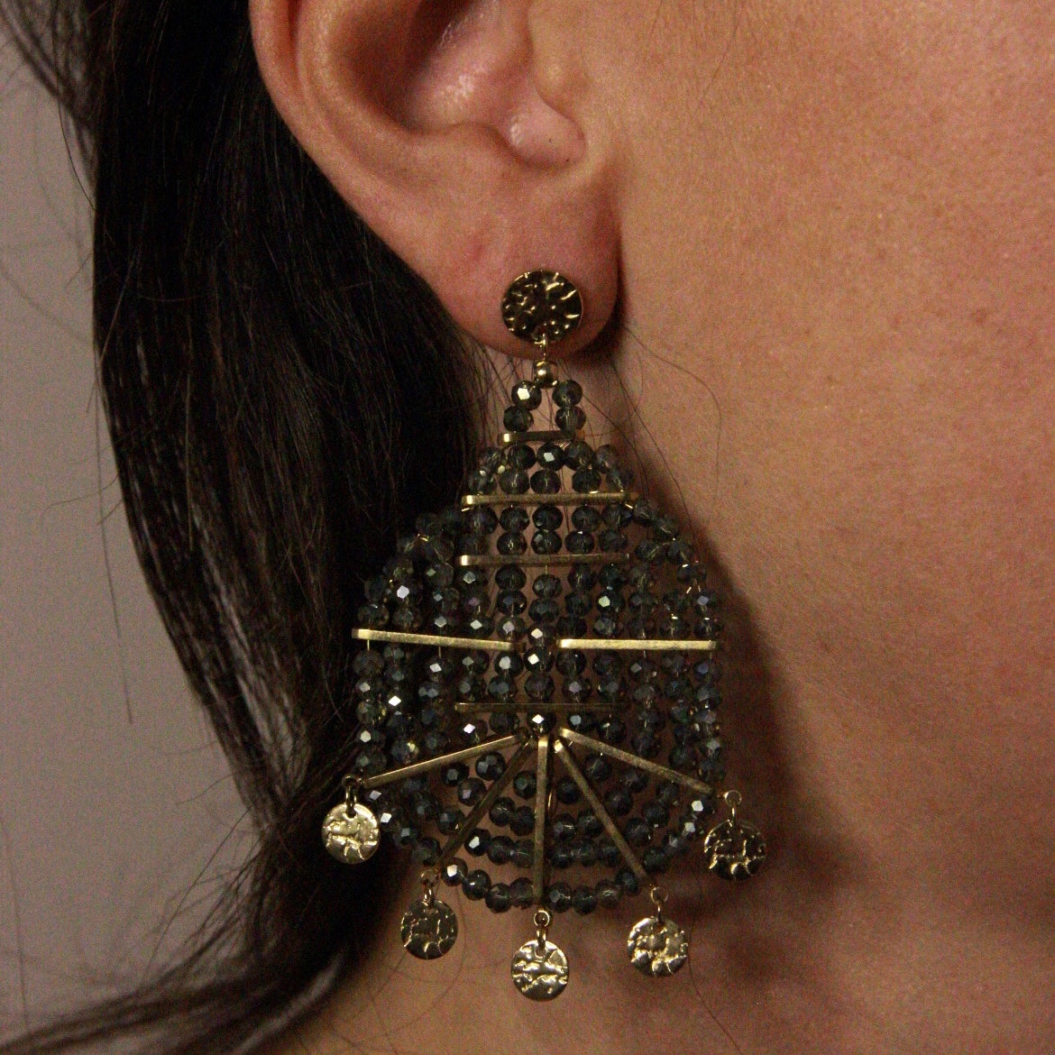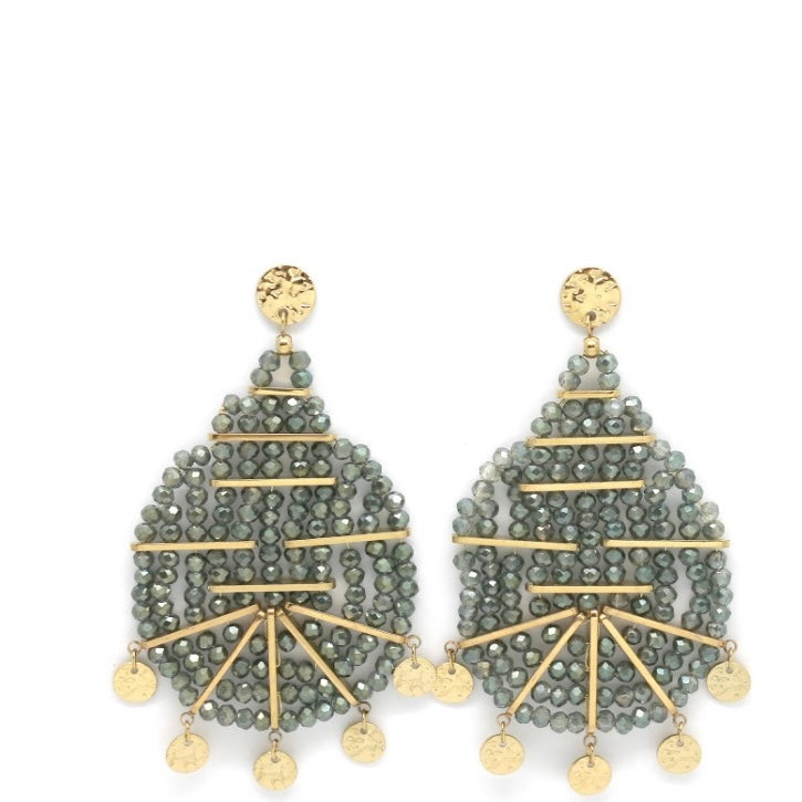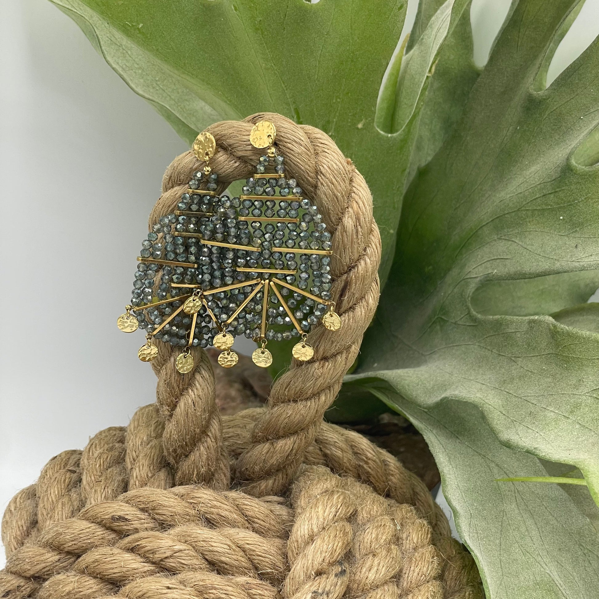 - Orecchino grande a piastra con pietre ovali verdi scure e perle pendenti oro