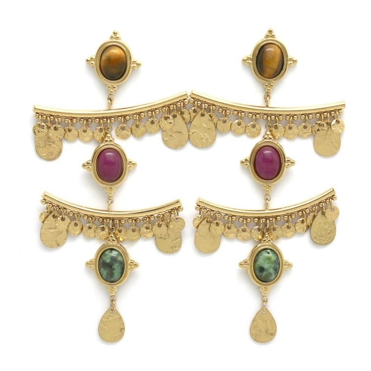 - Orecchini lungo Chandelier con pietre dure e gocce d’oro satinato